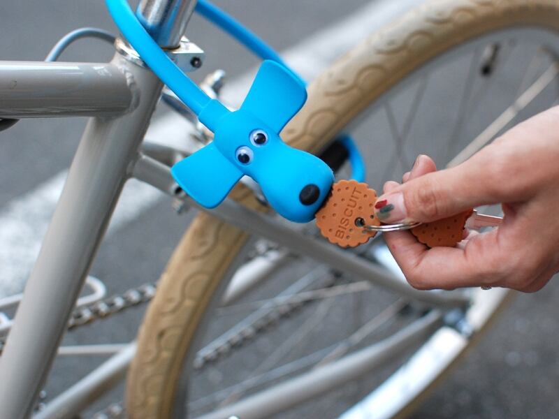 ビスケットを食べる犬のカギ。丸い目とポップなカラーで、なんとも言えぬ愛らしさです。自転車をまもりぬいたご褒美にビスケットを。