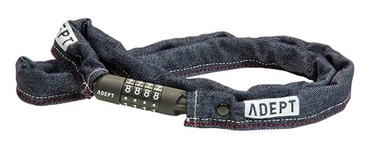 重量と強度のバランスが良い3.5mmチェーンを採用したダイヤル式チェーンロックです。ブラックとキャラメルはレザー調のカバーが付きデニムはその名の通りデニム調、ジェットブラックはザラザラとした肌触りのファブリックを使用してます。駐輪場の柱などと自転車をロックするのにちょうど良い長さです。乗車時はたすき掛けして持ち運ぶのも◎
